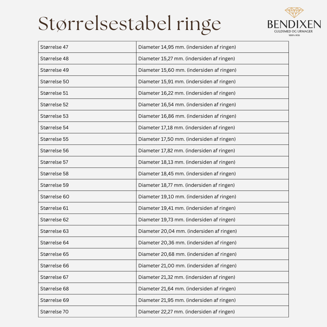 - Vi anbefaler at besøge en smykkeforretning for at få vejledning til din ringstørrelse. Størrelserne variere fra brand til brand og design og tykkelse på ringen kan også gøre at du enten skal gå en størrelse op eller ned.
